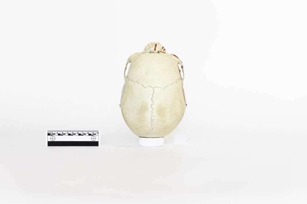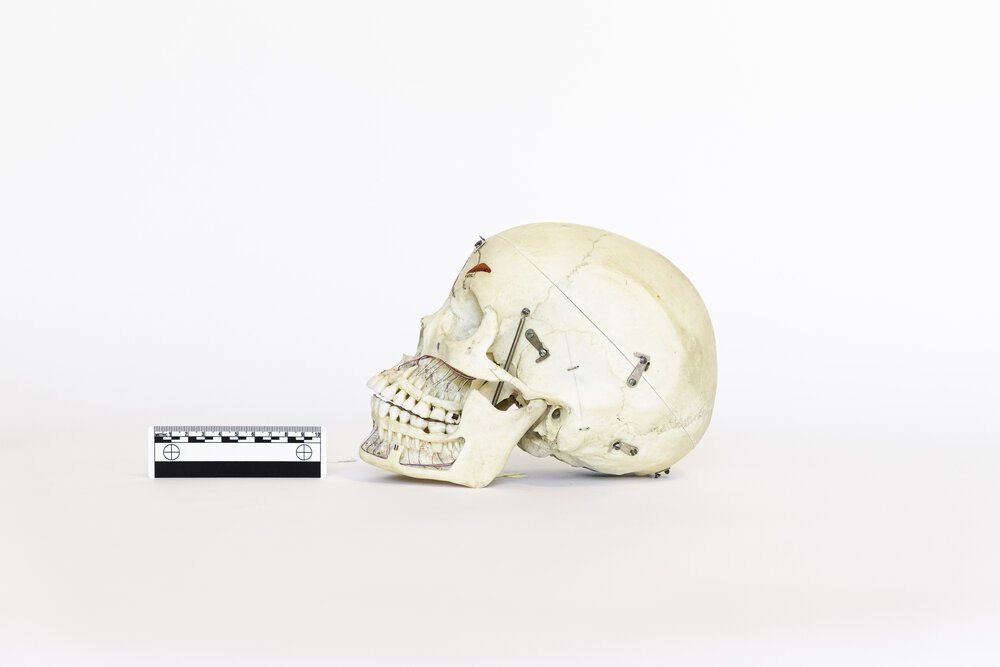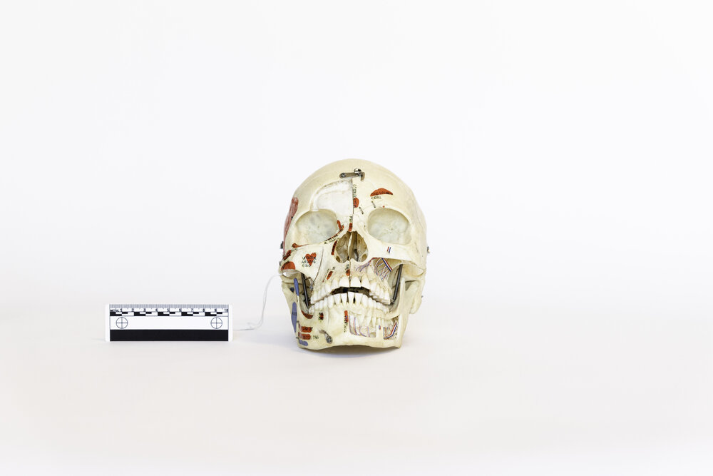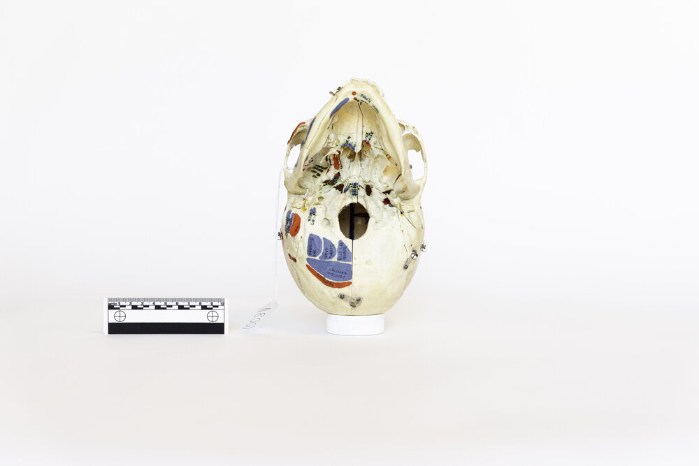 This piece was painted and cut for medical science as part of the medical osteology trade. It is presumed to be the skull of a middle-age, European female. Now available on the public market, this skull is an ornate preparation, designed to maximize understanding of human anatomy. These skulls are rare and beautiful pieces of medical history. Responsibly sourced, beautifully preserved, and thoughtfully selected.