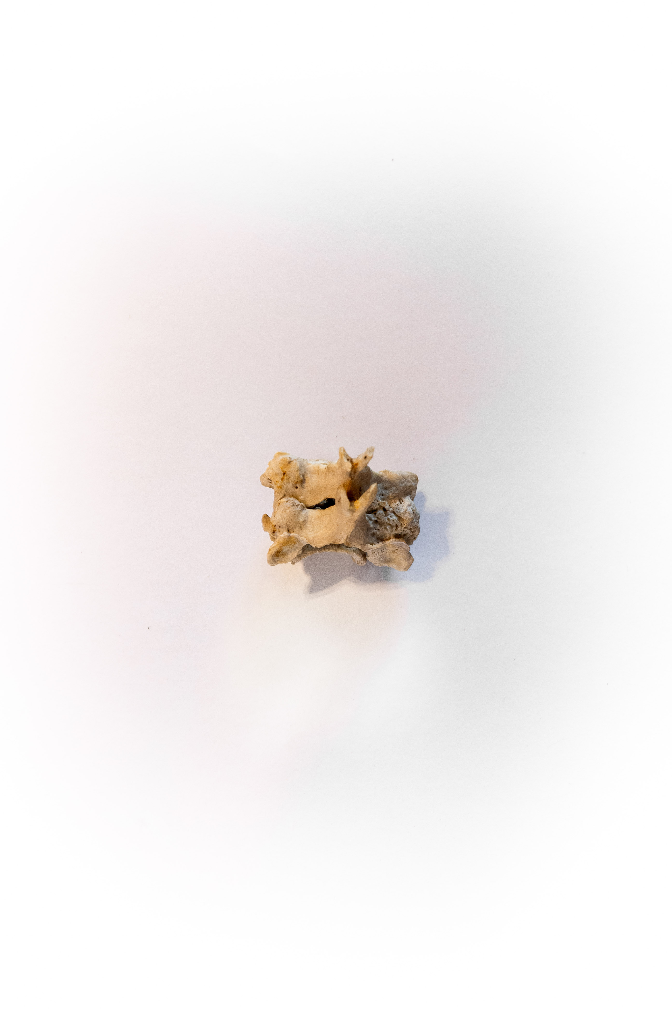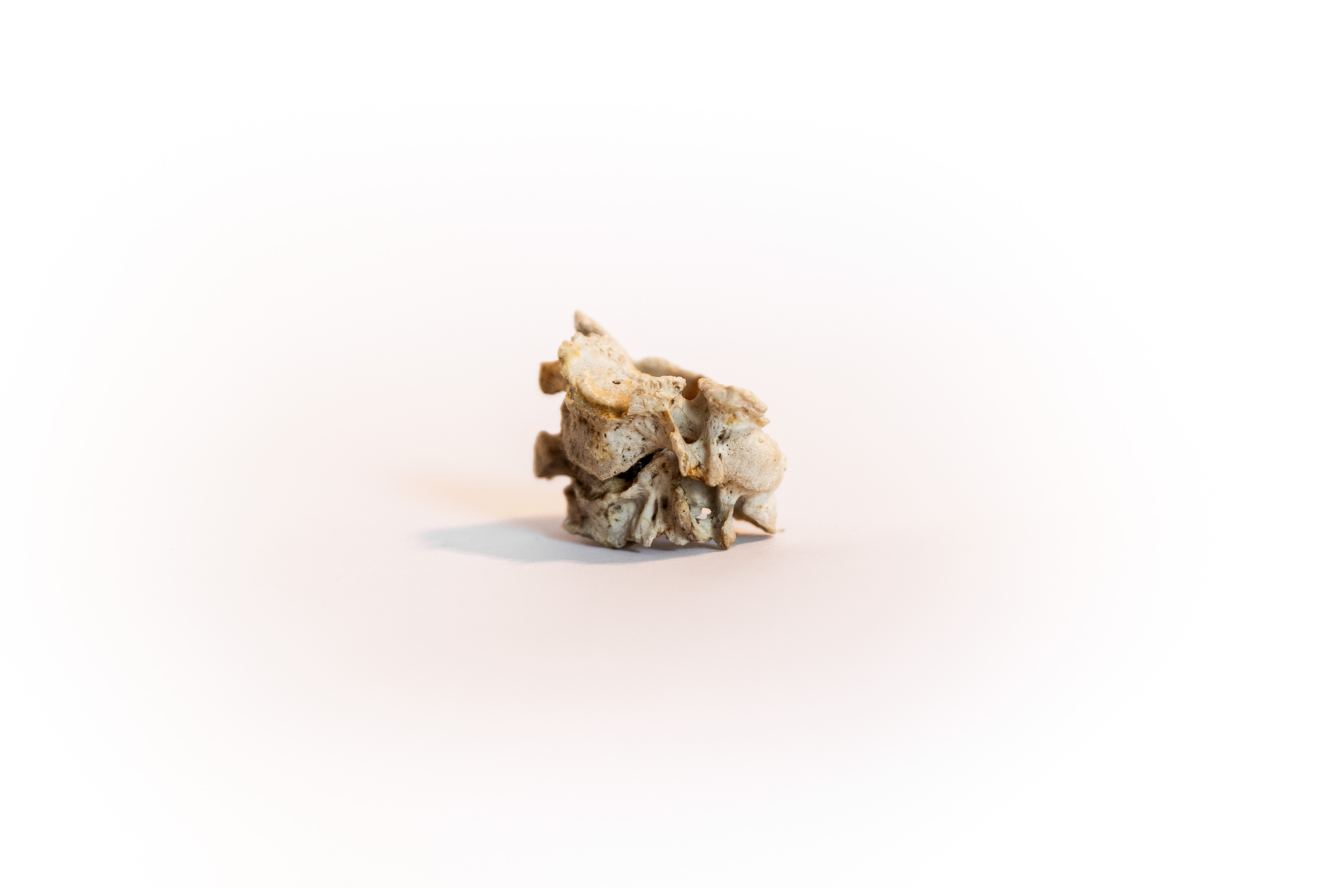 Every individual is born with thirty-three vertebrae. As we age, our vertebrae fuse, leaving most adults with twenty-four. This is a rare example of further fused vertebrae, presumably caused by a healed trauma resulting in these conjoined vertebrae. These fused vertebrae were located along the cervical region of the spine.