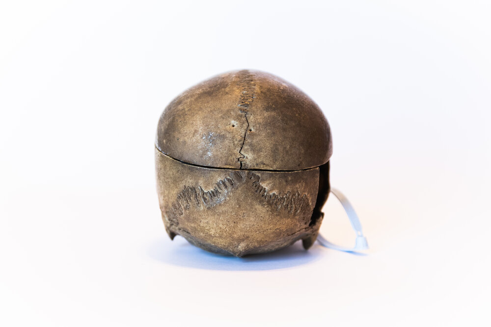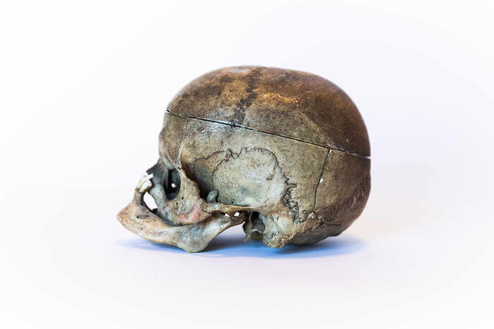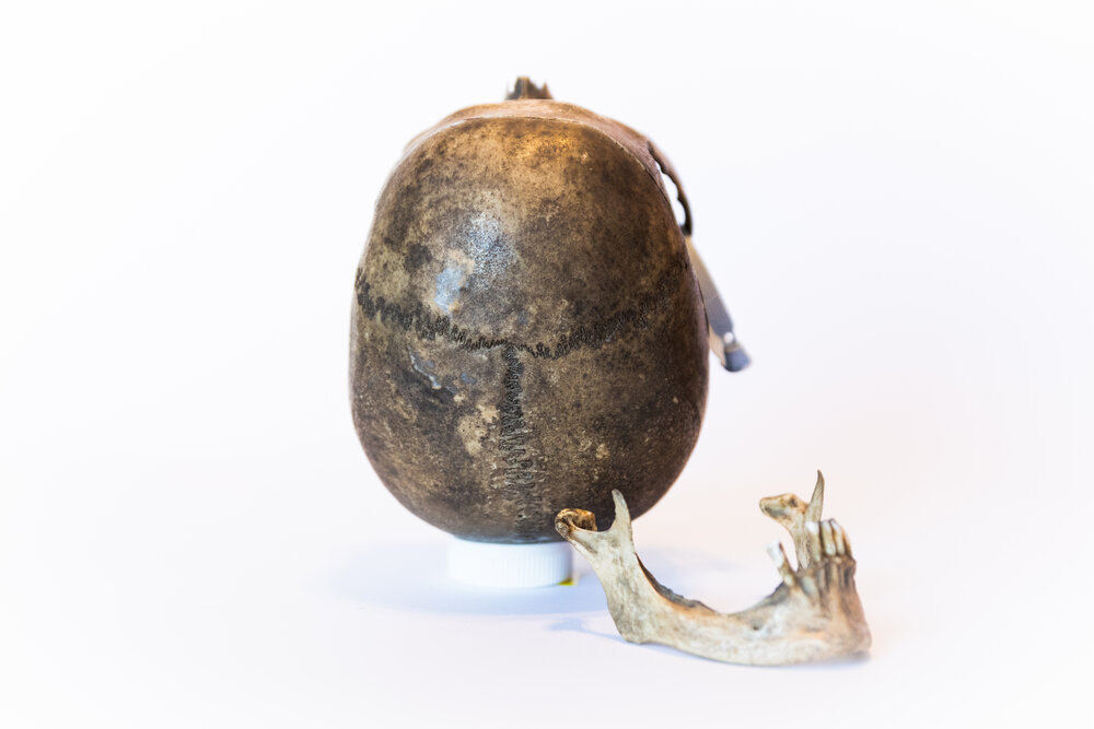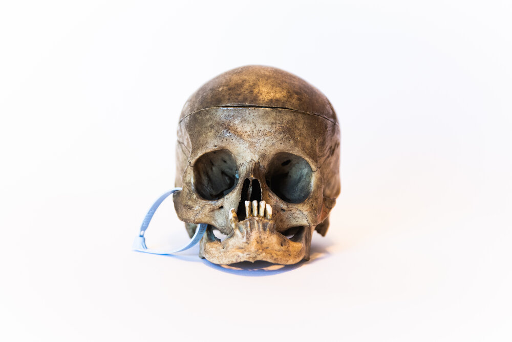 This skull is a prepared skull of a geriatric individual. Due to the loss of teeth during the individual’s lifetime, the mandible juts forward more than the average skull, resulting in an underbite. It is presumed to be the skull of a late-age, European female. This skull has some damage to the right of the cranium but remains a valuable teaching tool about the human aging process. Responsibly sourced, beautifully preserved, and thoughtfully selected, this skull is the perfect item for the respectful bone collector or medical student.