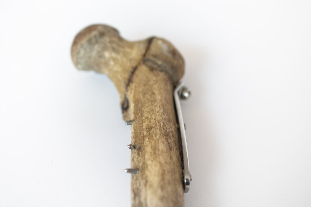 This is a medical specimen that has been used by surgeons to illustrate the fracture repair procedure to their students. It is a genuine human femur segment with an intertrochanteric fracture showing the pins and plate used to repair the hip. This is an interesting and unusual item with significant medical value.