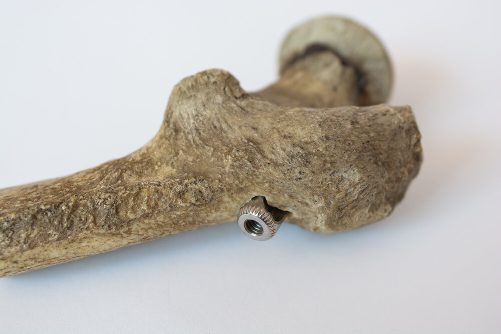 This is a human femur segment that has been pinned to show the repair for a femoral neck fracture. It is an exceedingly unusual item and was most likely a teaching aid or a demonstration model for surgeons. It is a one-of-a-kind piece.