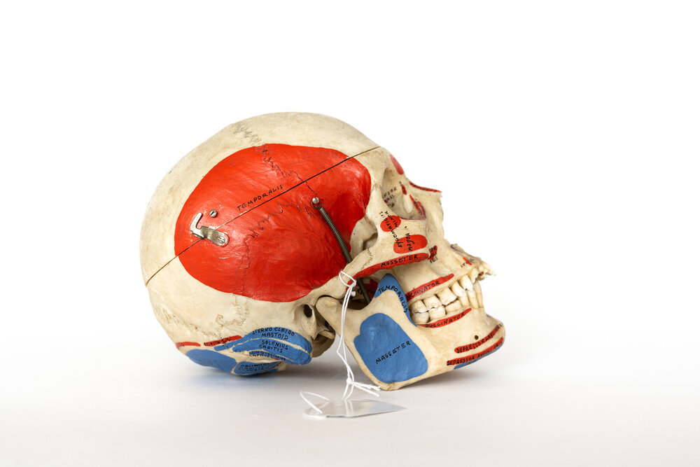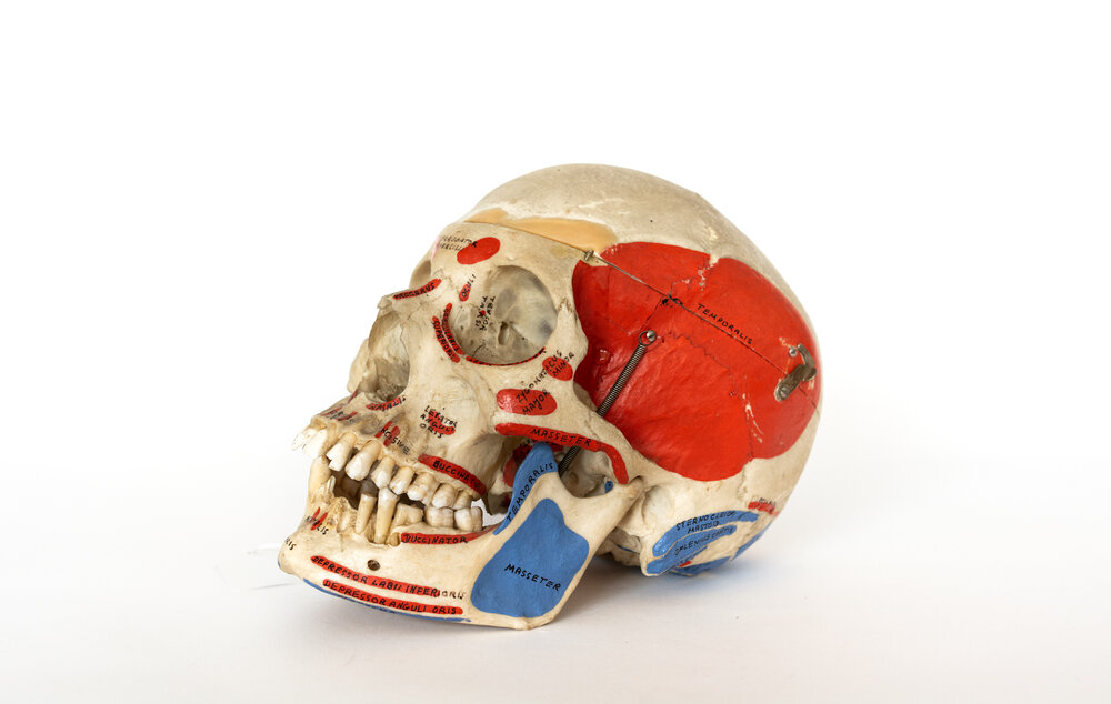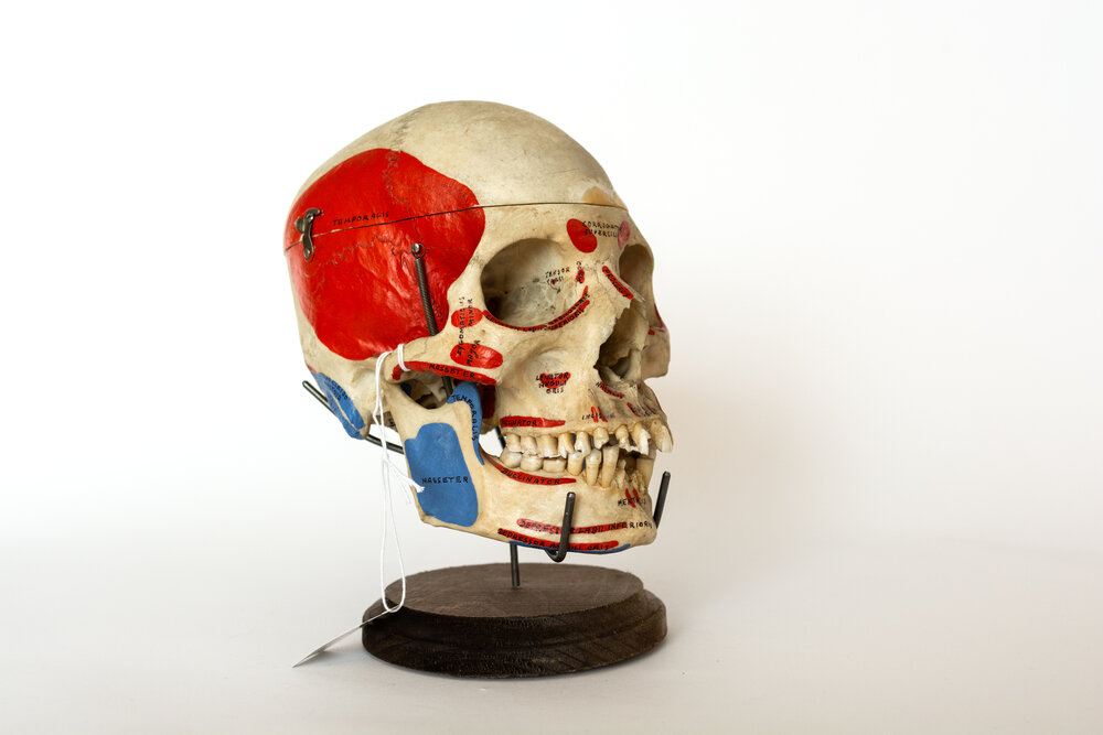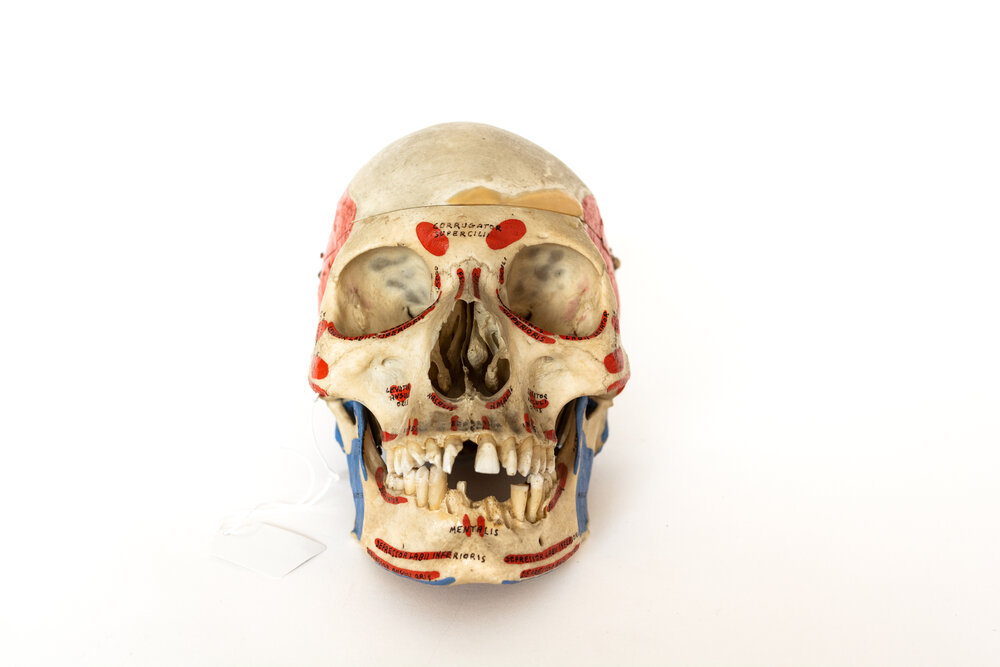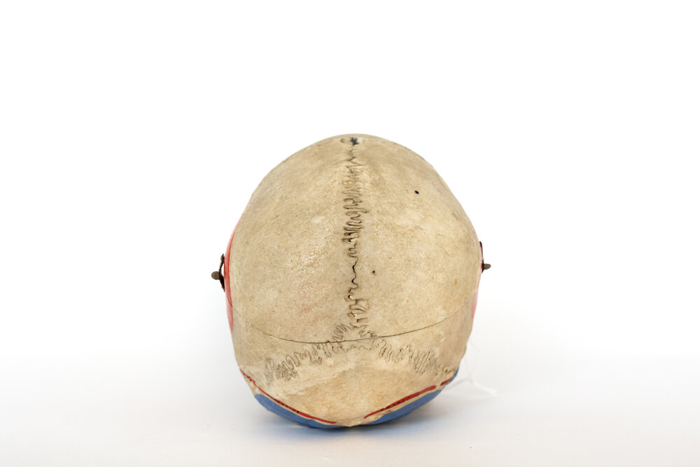 This piece was painted and cut for medical science as part of the medical osteology trade. Now available on the public market, this skull is an ornate preparation, designed to maximize understanding of human anatomy. These skulls are rare and beautiful pieces of medical history. Responsibly sourced, beautifully preserved, and thoughtfully selected.