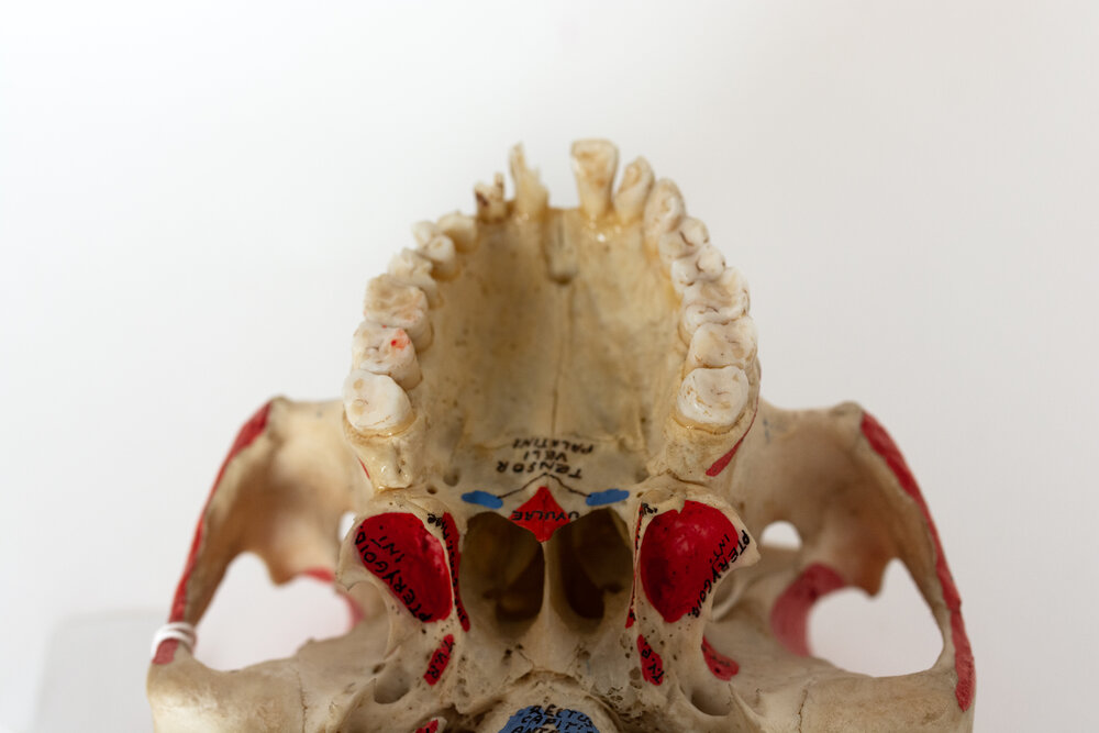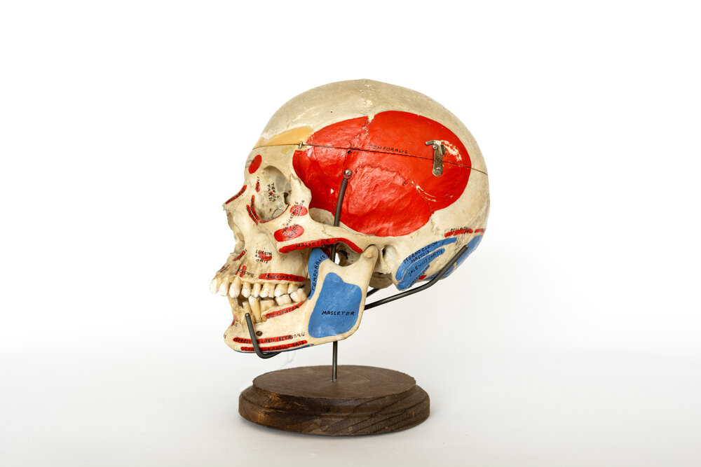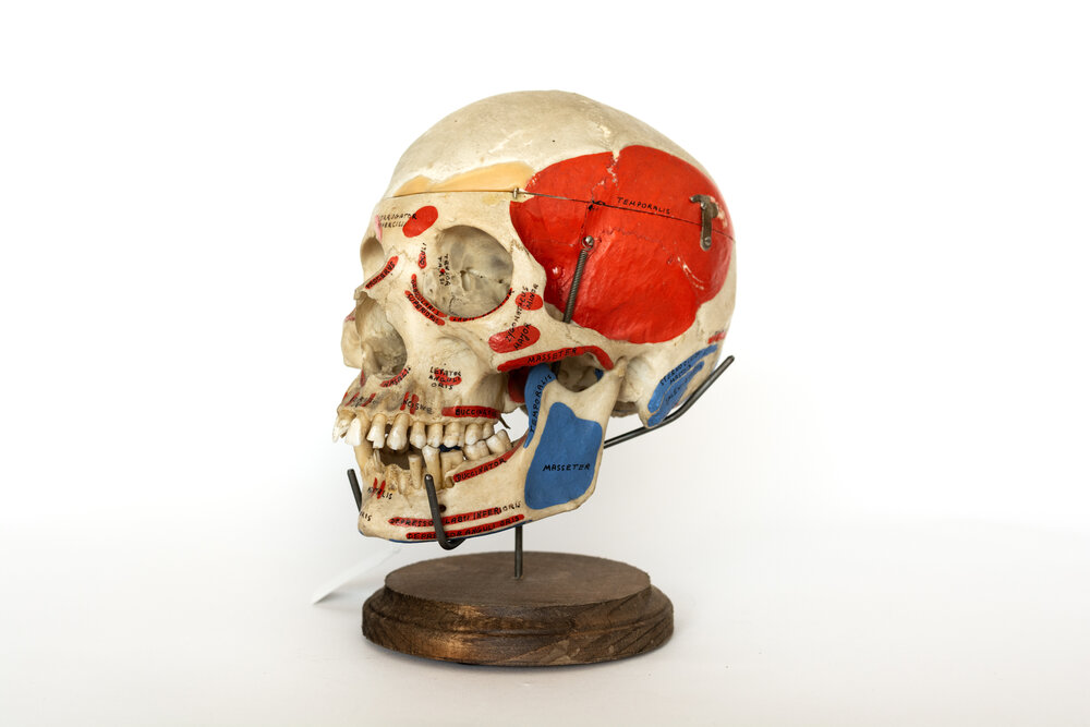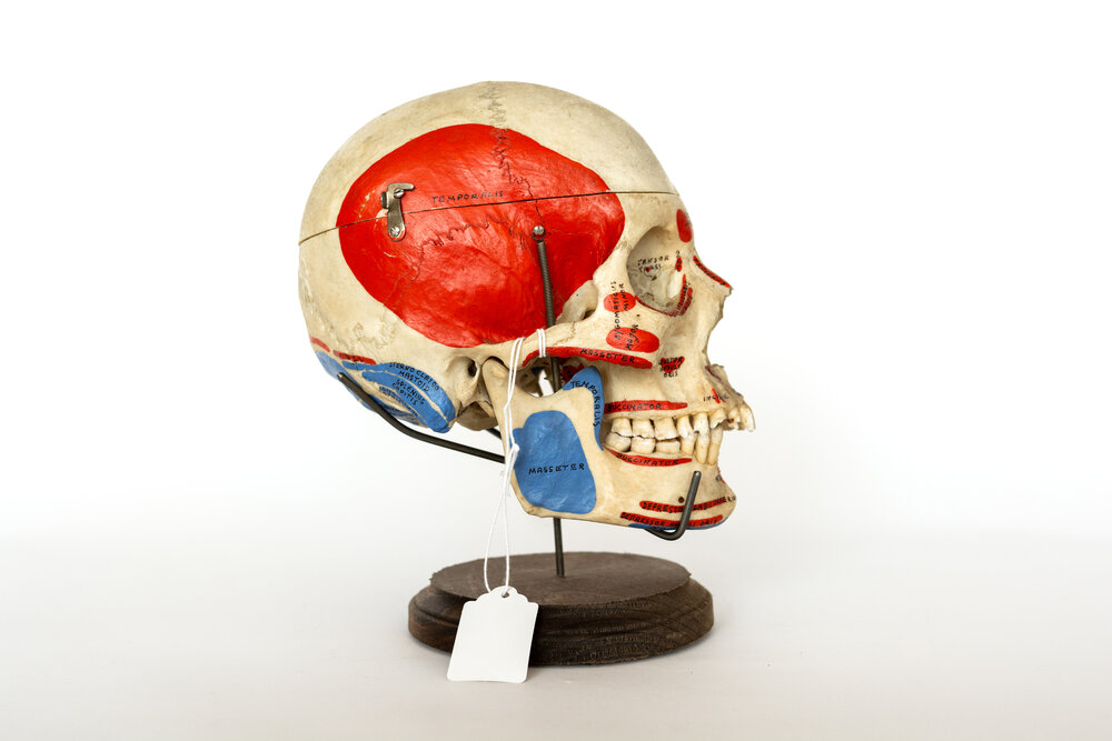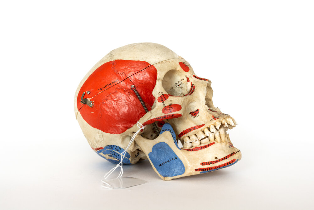This piece was painted and cut for medical science as part of the medical osteology trade. Now available on the public market, this skull is an ornate preparation, designed to maximize understanding of human anatomy. These skulls are rare and beautiful pieces of medical history. Responsibly sourced, beautifully preserved, and thoughtfully selected.