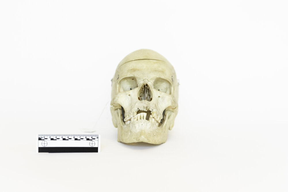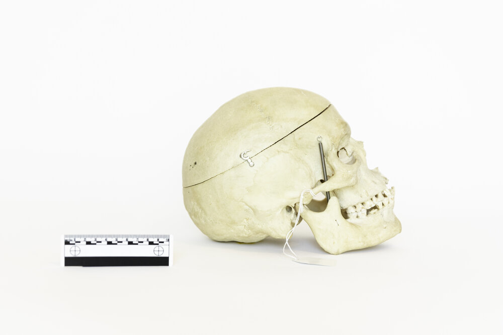 This specimen is a skull prepared as a teaching tool for medical students. With its simple autopsy cut for easy removal of the skull cap, this skull is perfect for understanding the inner structure of the cranium. It also features jaw springs, for the articulation of the mandible. Originally donated by an individual for the advancement of medical science, this skull has now found its way from an educational device to the public market. Responsibly sourced, beautifully preserved, and thoughtfully selected, this skull is the perfect item for the respectful bone collector or medical student.