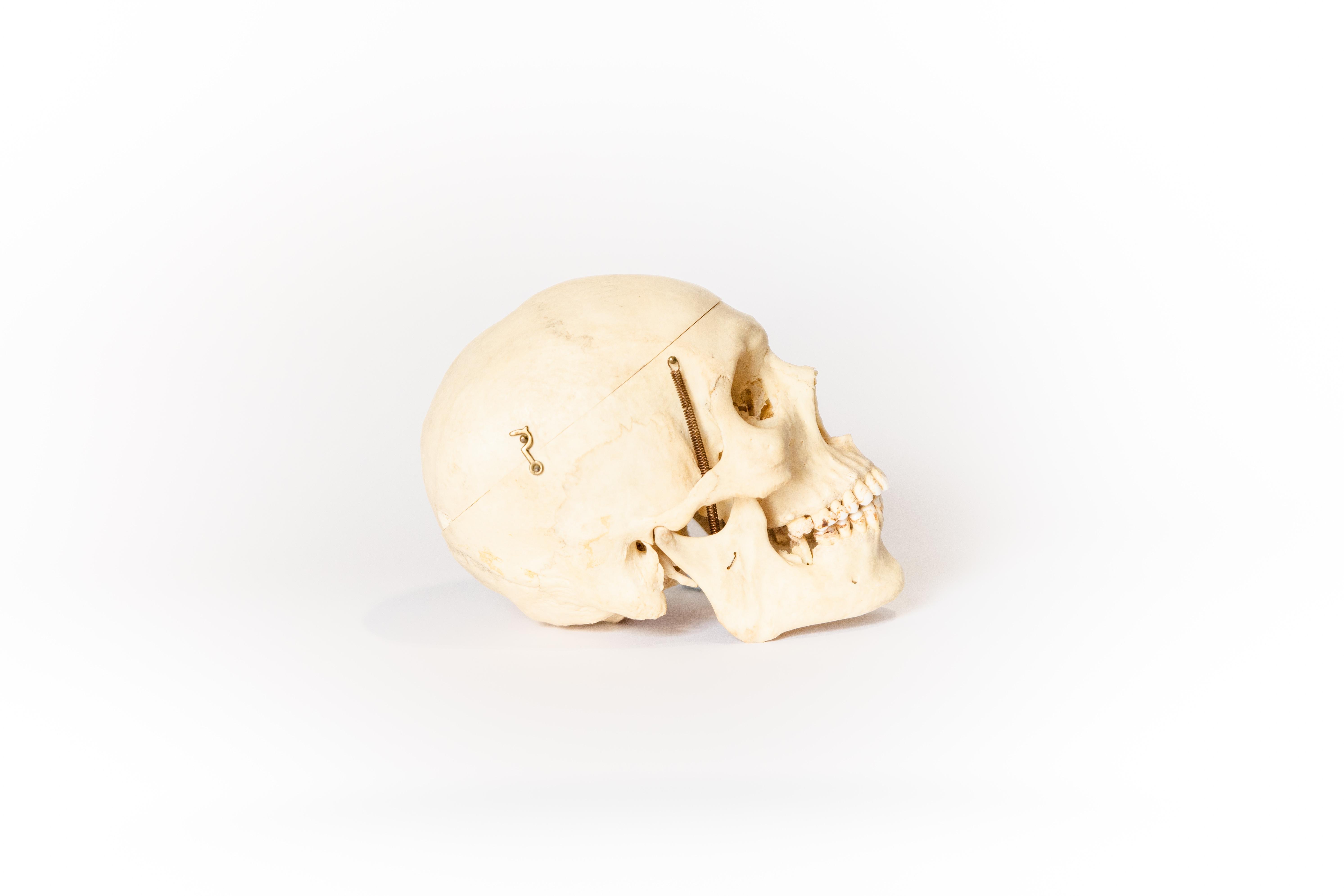 This specimen is a skull prepared as a teaching tool for medical students. With its simple calvarium (or autopsy) cut for easy removal of the skull cap, this skull is perfect for understanding the inner structure of the cranium. It also features jaw springs, for the articulation of the mandible. This skull has now found its way from an educational device to the public market. The dentition of this skull features staining from the betel nut, and a severe cavity in the right lower molars. Betel nut consumption is popular in the Calcutta region. Responsibly sourced, beautifully preserved, and thoughtfully selected, this skull is the perfect item for the respectful bone collector or medical student.
