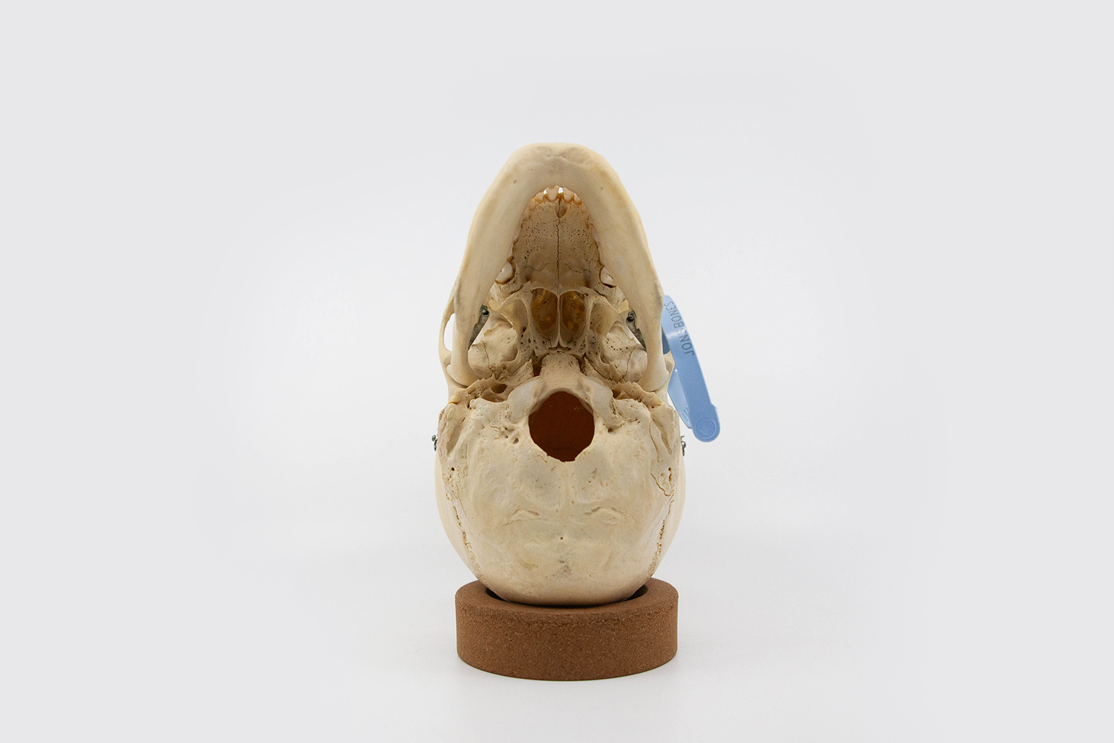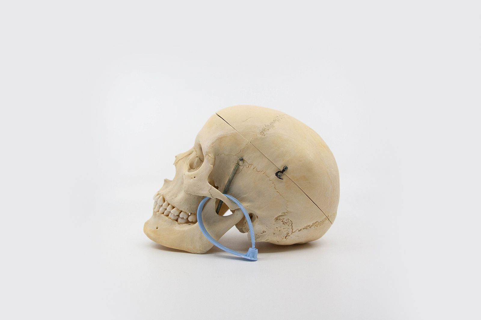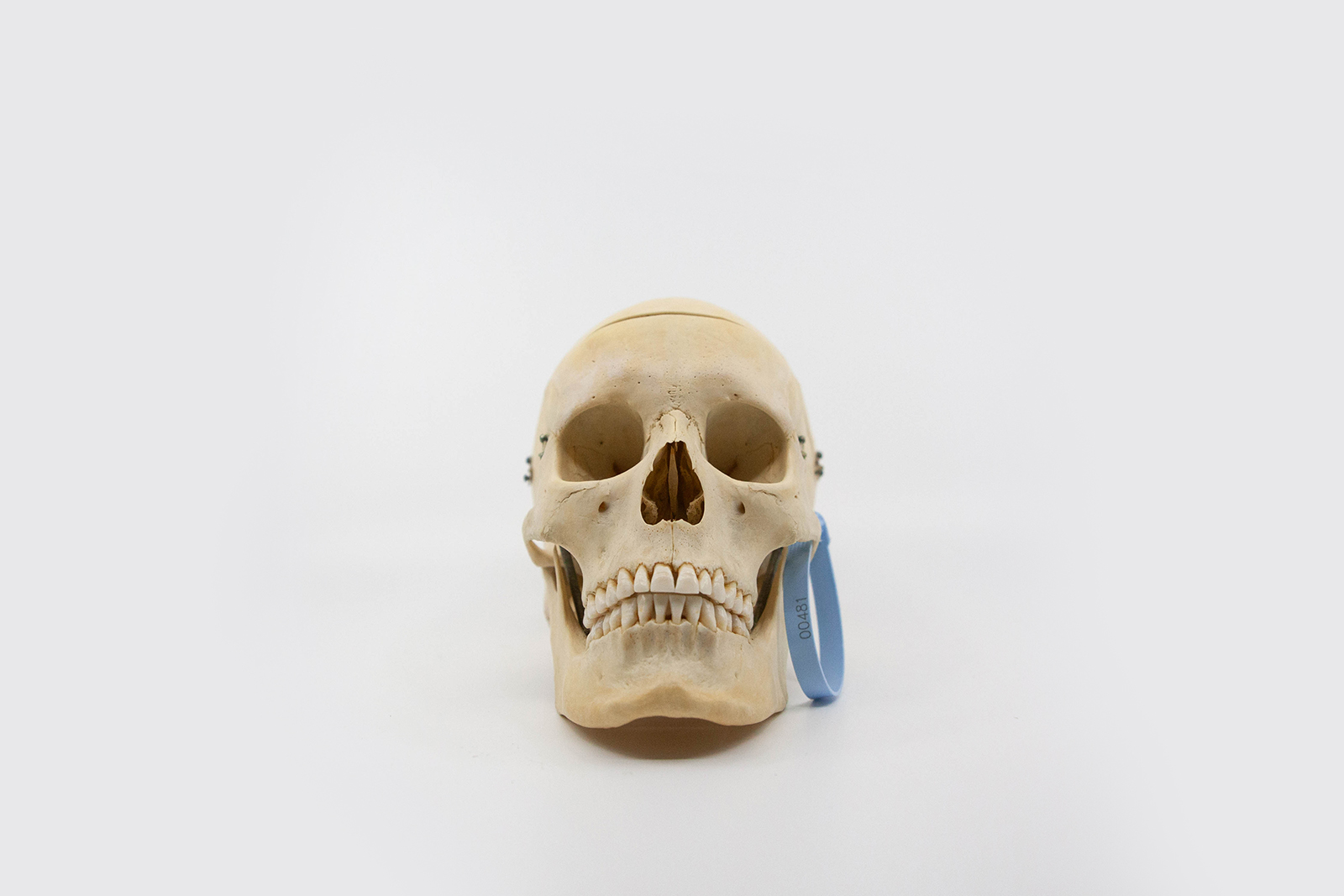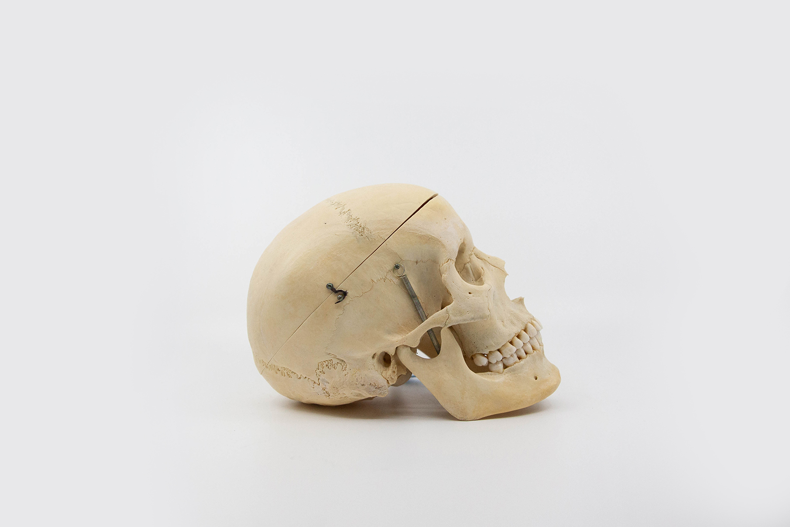 This specimen is a skull prepared as a teaching tool for medical students. With its simple calvarium cut for easy removal of the skull cap, this skull is perfect for understanding the inner structure of the cranium. It features a stainless steel spring, allowing for easy removal of the mandible. This skull has great dentition, with all teeth present, and a white patina. Additionally the skull has prominent infraorbital foramina, the two round openings on the maxilla. Responsibly sourced, beautifully preserved, and thoughtfully selected, this skull is the perfect tool for medical students, working professionals, and individuals interested in learning about osteology.