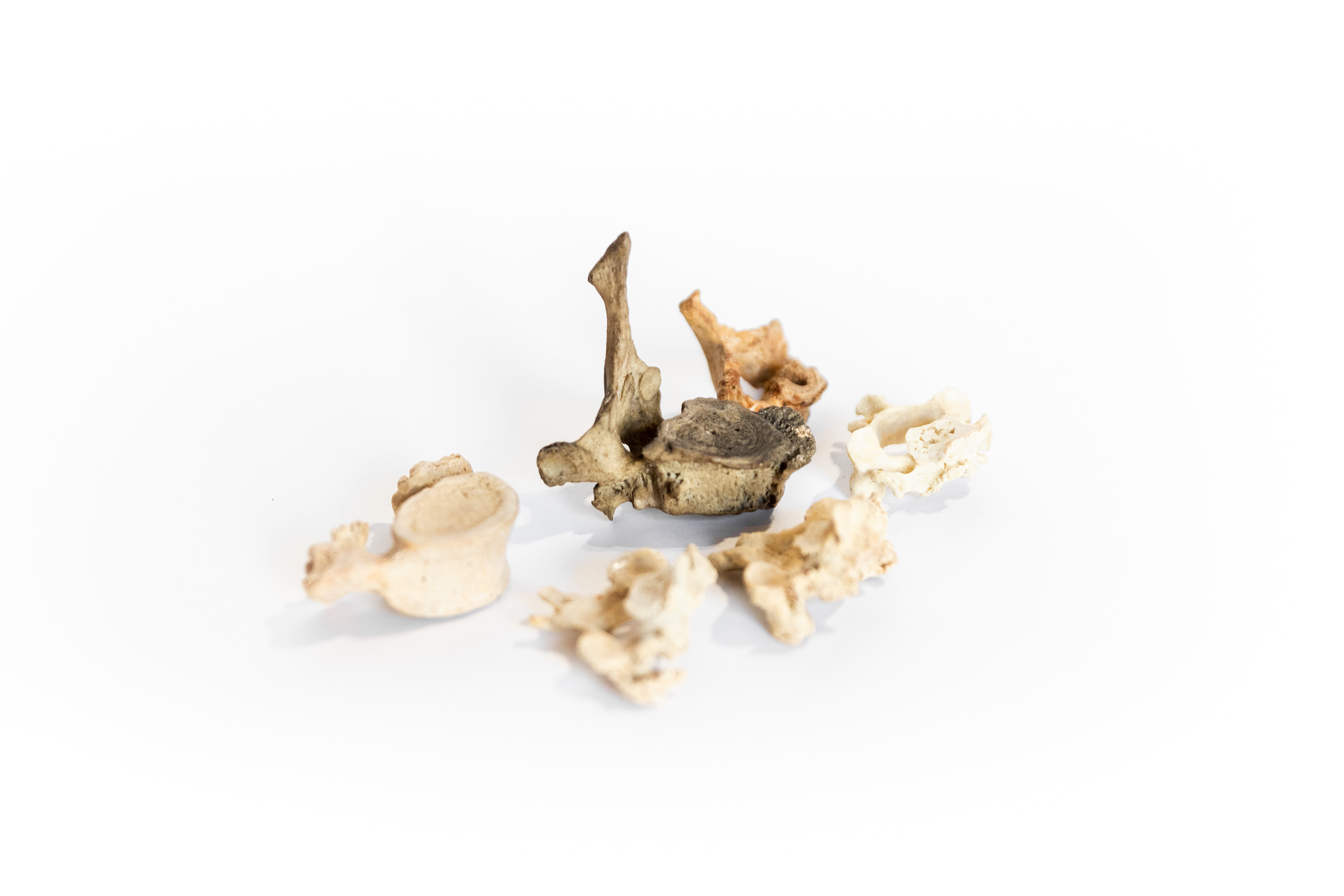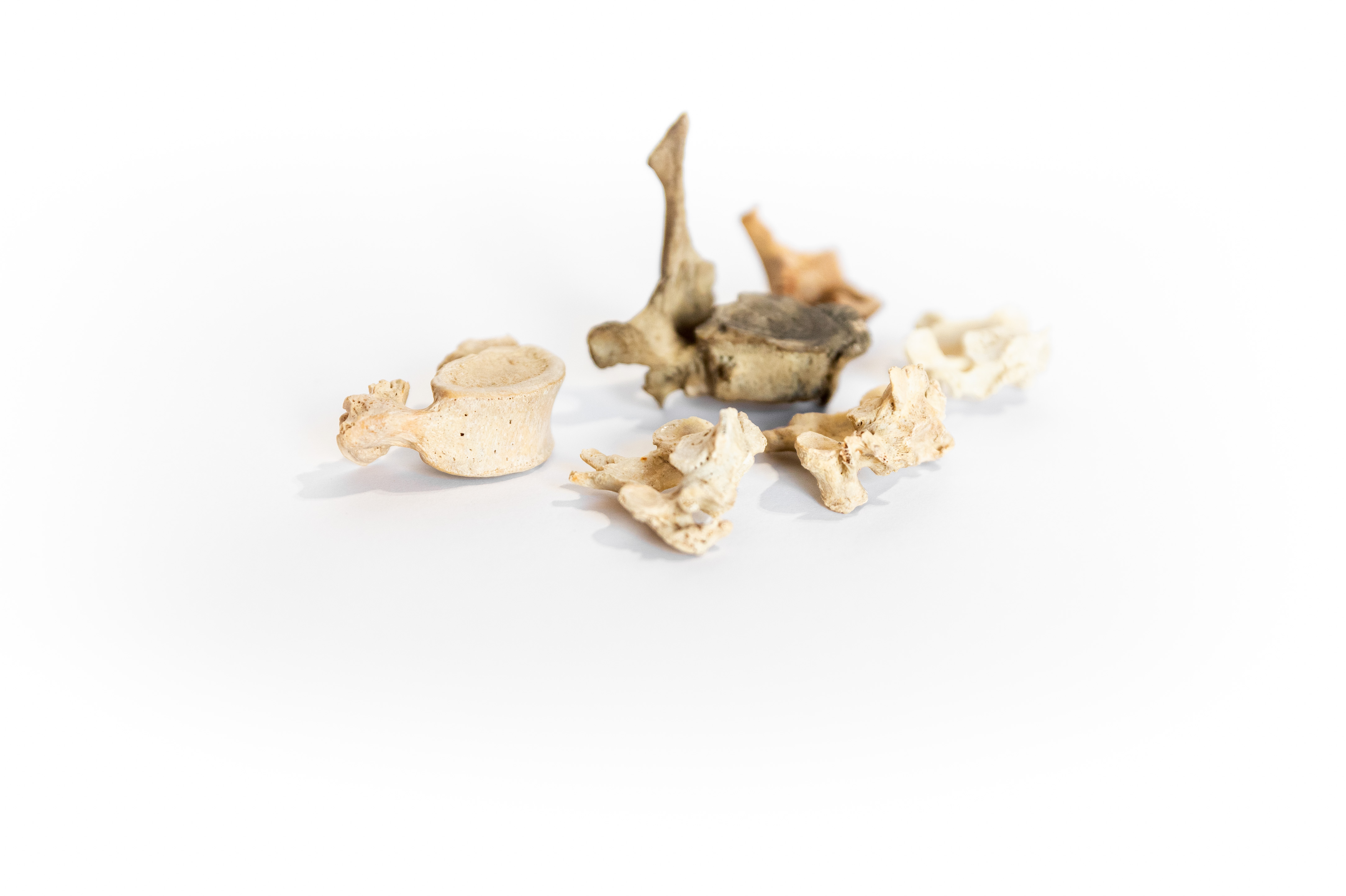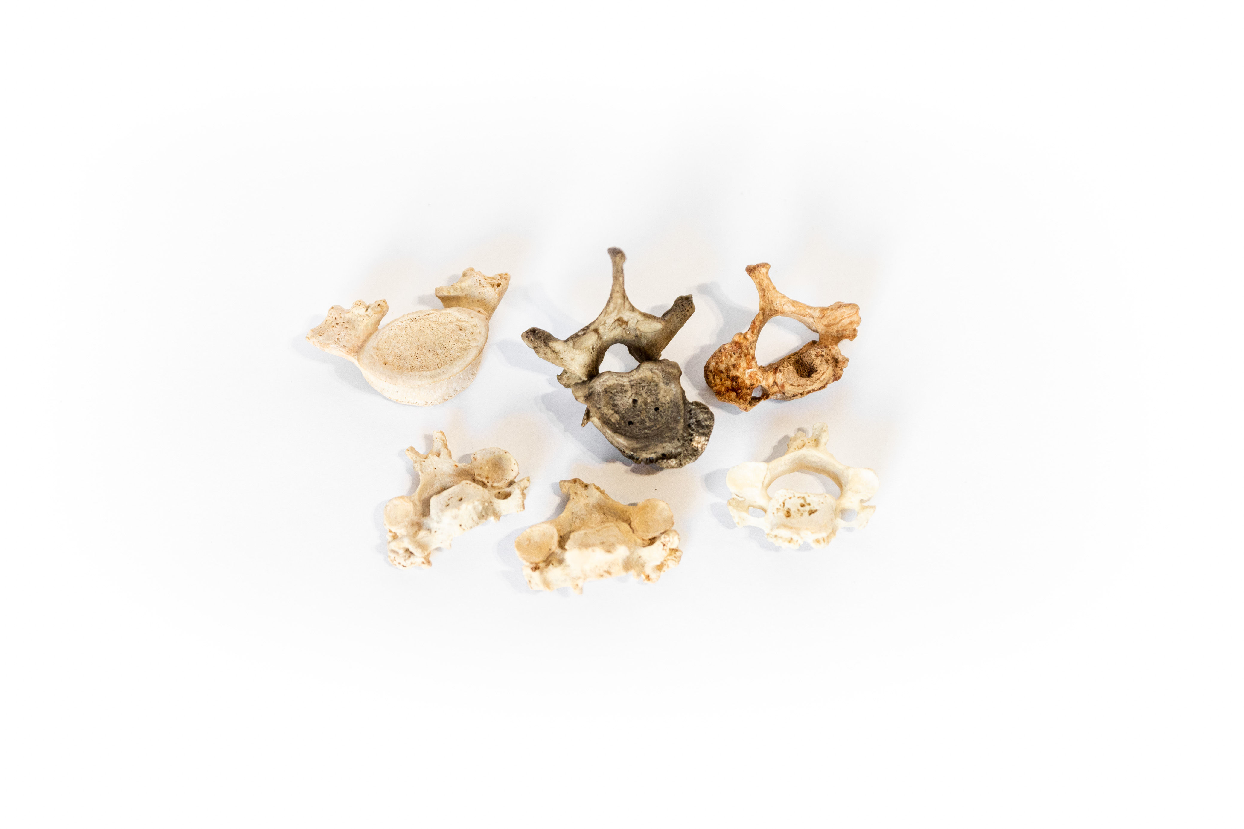 Every individual is born with thirty-three vertebrae. As we age, our vertebrae fuse, leaving most adults with twenty-four. This set demonstrates a variety of different spinal conditions such as bone spurs, osteoarthritis, and others. Due to skeletal variation, each individual vertebra sold will differ in size, shape, and patina. This set includes six vertebrae.
